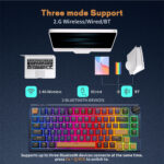 • THREE MODES – Believe it or not, this is the first generation of RGB three-mode wireless keyboards on the market. Wireless mode with stable bluetooth 5.0, hassle-free 2.4Ghz dongle plus USB-C wired mode set no limits about your keyboard connection.