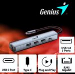 5 in 1 Hub Genius UH-545 : 1x Gigabit Ethernet RJ45 Output- 1x USB-C Power Supply port – 1x USB-A 3.0 Data Ports – 15cm cable Type C | Silver