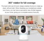 - 360° rotation for full coverage : The dual-motor pan-tilt zoom design enables the lens to rotate up, down, left and right. When checking your smartphone outside your home, you can have a panoramic view of what happens at your home, giving you a complete sense of security.