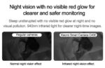- Night vision with no visible red glow for clearer and safer monitoring : Sleep undisrupted with no visible red glow at night and no visual pollution. 940nm infrared light for clearer night-time images.